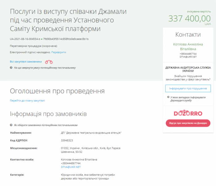 Замовник вже уклав угоду з фізичною особою-підприємцем Сусанною Алімівною Джамаладіновою (співачкою Джамалою) щодо її виступу в київському концертно-виставковому центрі “Парковий”. Переговори пройшли за скороченою процедурою.