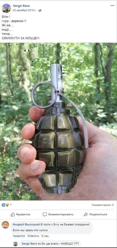 “Виникає питання: як колишній АТОшнік, який повинен розумітися на зброї, допустив вибух гранати в руках? Попередню відповідь на це питання можливо додає той факт, що серед знайдених поліцейськими запалів виявлений один з “підрізаною” запобіжною чекою, при застосуванні такого запалу, чека не працює, тому ймовірно в руках у загиблого виявилася саме така граната, що і призвело до трагедії”, – повідомив правоохоронець.