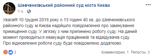 Спершу інформація з’явилася на сторінці Шевченківського райсуду у соцмережі Facebook. “10 грудня 2018 року о 13 годині 40 хв. у Шевченківський районний суд Києва надійшло повідомлення про замінування приміщення установи. У зв’язку з чим припинено роботу суду. Нині проводиться евакуація працівників та відвідувачів. Про відновлення роботи буде повідомлено додатково”.