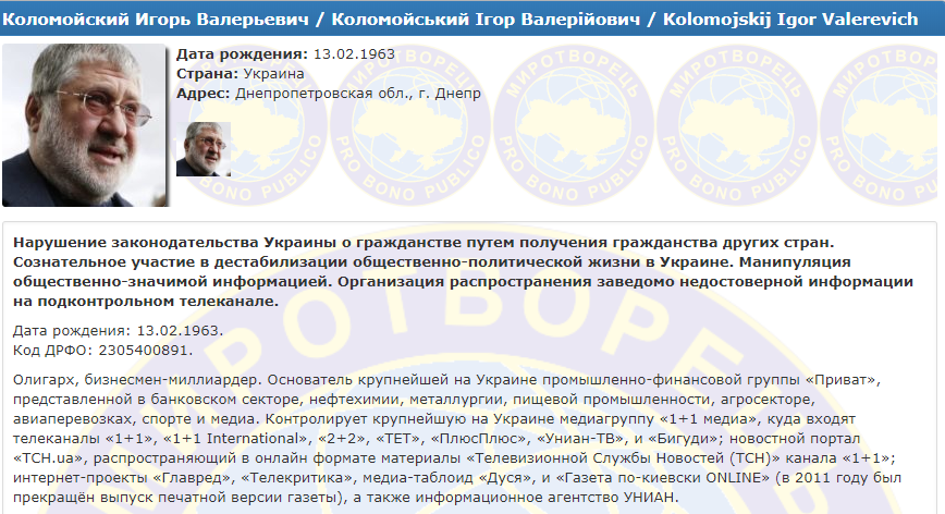 Причиною появи профілю олігарха зазначено наступне: “Порушення законодавства України про громадянство шляхом отримання громадянства інших країн. Свідома участь в дестабілізації суспільно-політичного життя в Україні”.