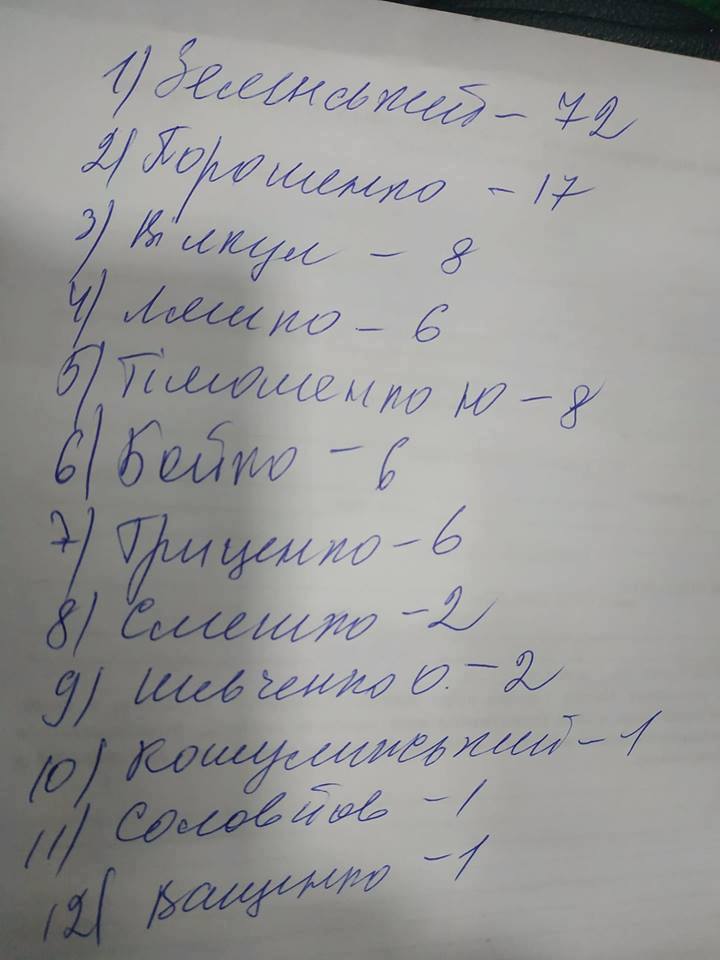 Так, за Володимира Зеленського проголосували 517 осіб, Петра Порошенка — 470, Олега Ляшка — 52, Руслана Кошулинського — 46, Юлію Тимошенко — 38, Анатолія Гриценка – 29, Ігоря Смешка — 28, Олександра Вілкула — 13, Юрія Бойка — 12, Юрія Тимошенка — 4.