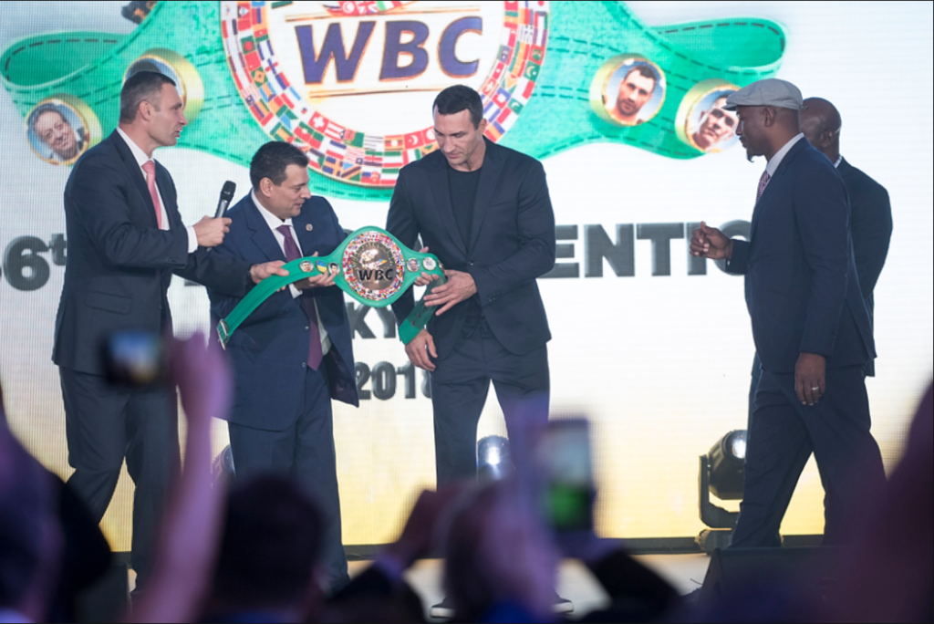 Відбулося це під час церемонії відкриття 56-го конгресу WBC у Києві. Передали Володимиру пояс після узгодження із легендами WBC Ленноксом Льюїсом та Евандером Холіфілдом, повідомляється на сайті мера столиці.