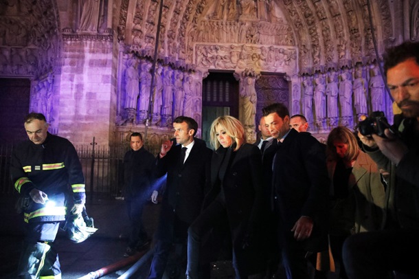 В палаючий Нотр-Дам зайшов президент Франції Еммануель Макрон, який знаходився поруч з ним практично з вечора. Він висловив співчуття і пообіцяв відновити храм.